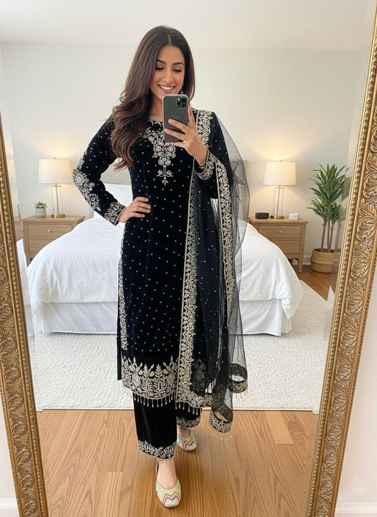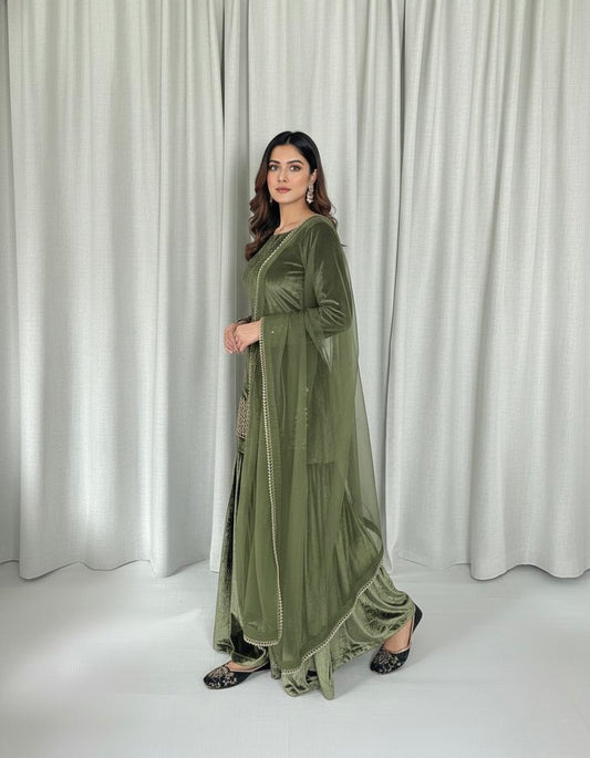 Zari Embroidery work Pakistani Velvet Kurti Pant Dupatta Set(Stitched)