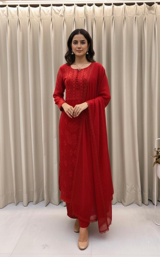 Georgette Chikankari Kurti Palazzo Dupatta Set
