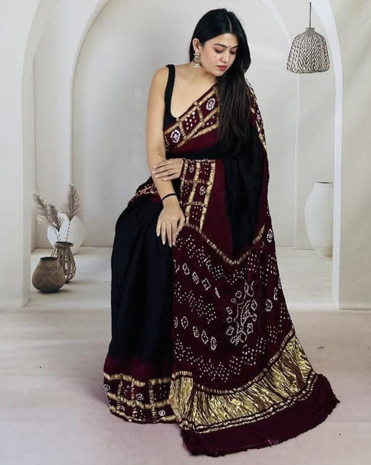 Modal Silk Gharchola Golden Chex work Jamnagar Bandhani Saree