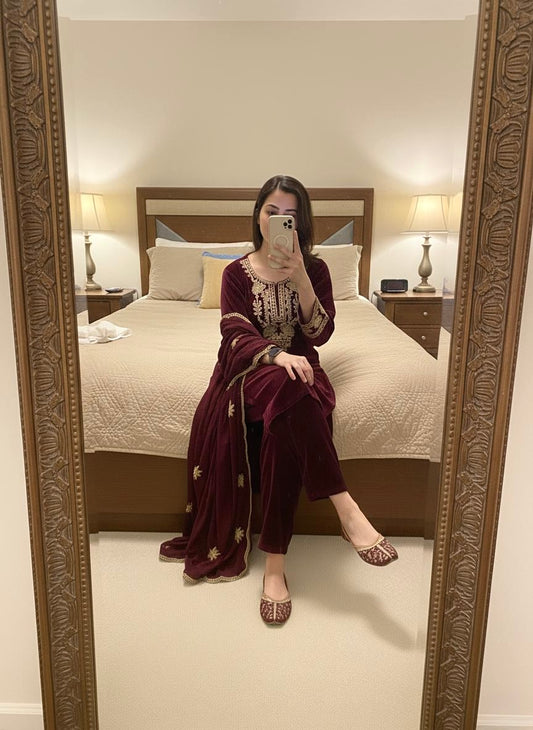 Zari Embroidery work Pakistani Velvet Kurti Pant Dupatta Set(Stitched)