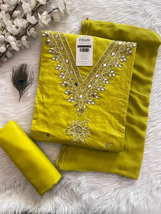 Chanderi Hand Moti and Mirror work Salwar Dress Material (Stitched)