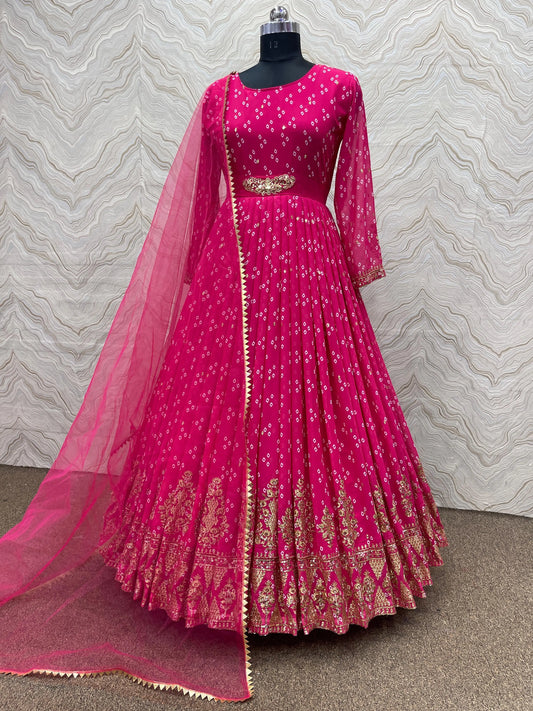 Faux Georgette Leheriya Print Anarkali 4M Flair Kurti Pant Dupatta Set (Ready To Wear)