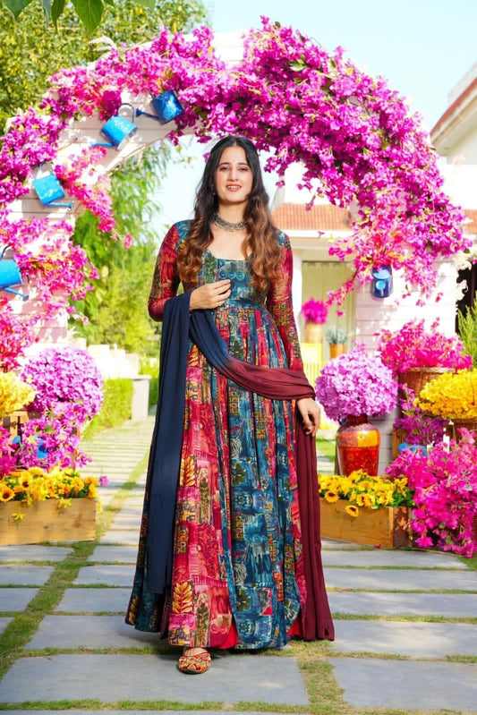 Muslin Digital Print Flair work Kurti Dupatta Set