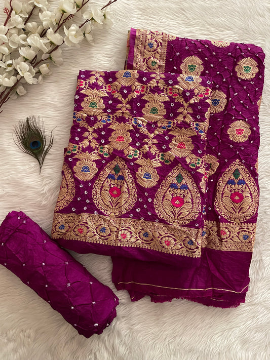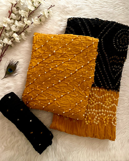 Ghazi Silk Kasab Golden Embroidery work Bandhani Dress Material (Unstitched)