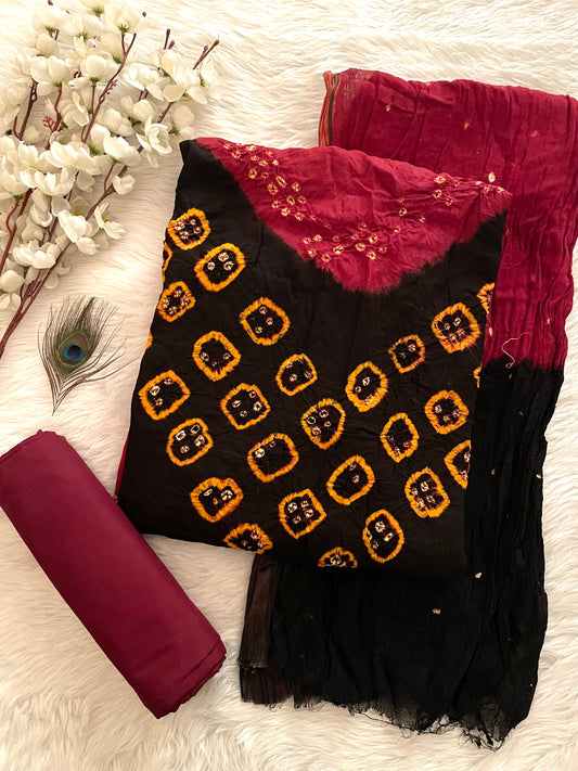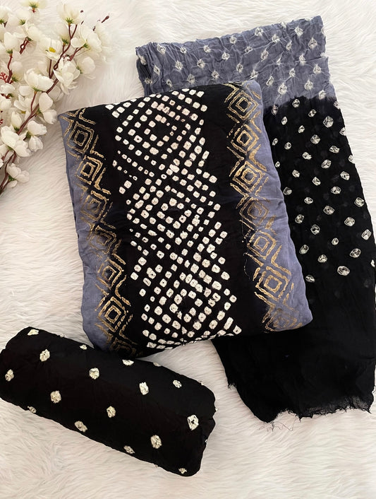 Cotton Satin Barik Bandhej work Black Bandhani Dress Material (Unstitched)