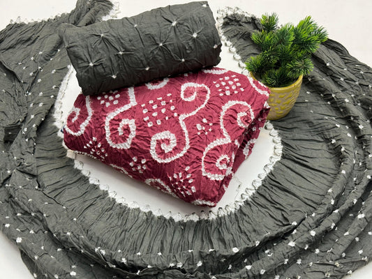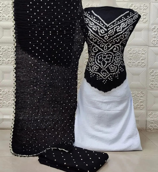 Cotton Satin Kusum Kutch Bandhej Work Contrast Bandhani Dress Material