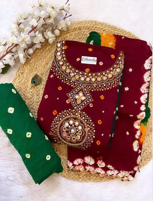 Cotton Satin Hand Crafted Kutchi Bandhani Dress Material