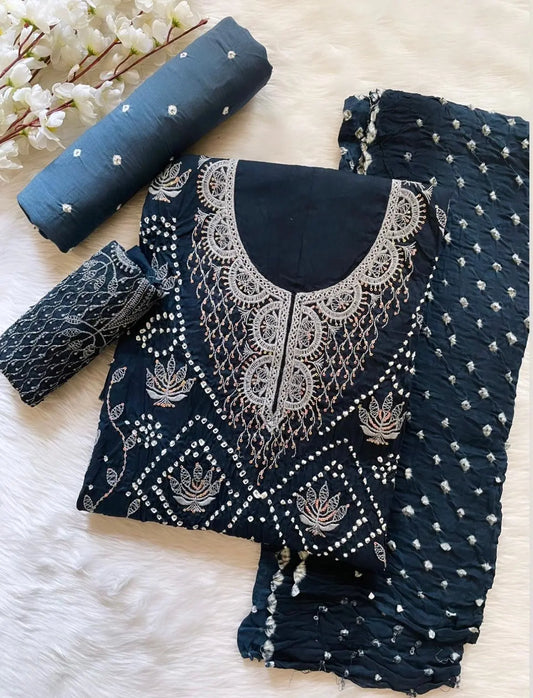 Cotton Satin Neckline Mirror Thread work Bandhani Dress Material (Unstitched)