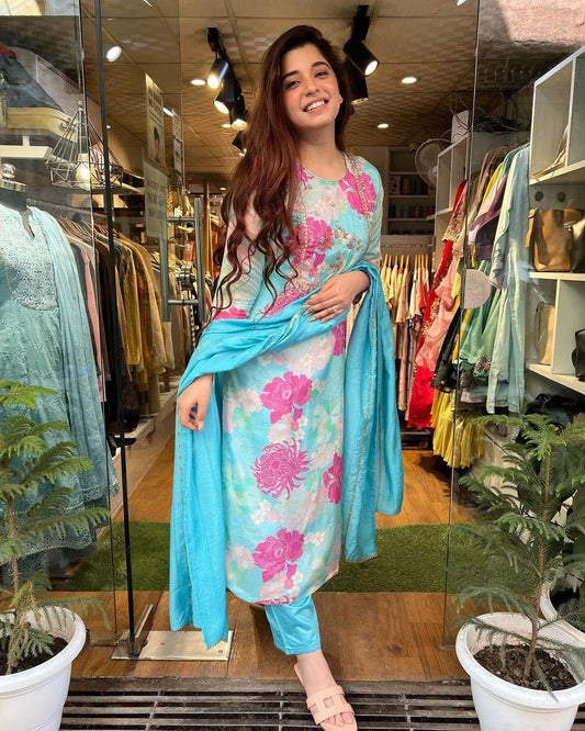 Floral Digital Print Kurti Pant Dupatta Set (Stitched)