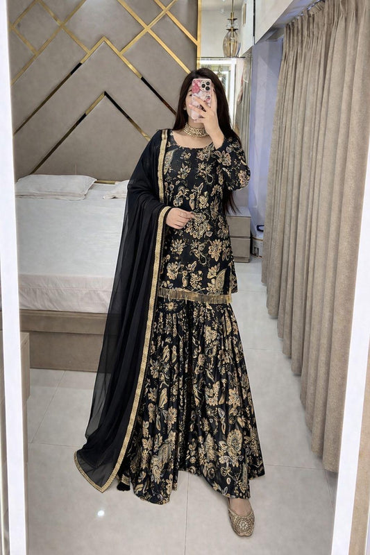 Sequence Embroidery Work Trending Kurti Sharara Dupatta Set