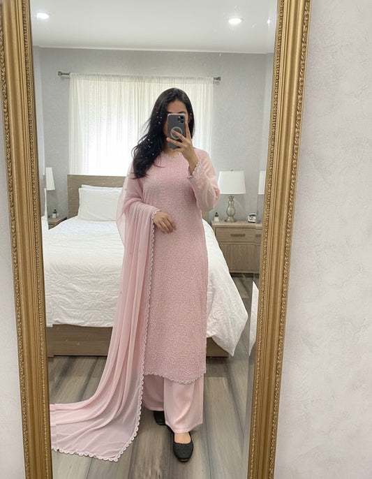 Georgette Chikankari Kurti Palazzo Dupatta Set