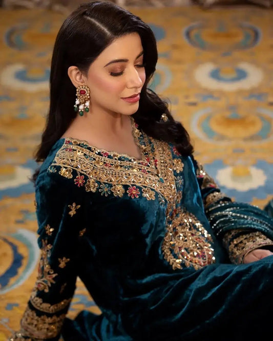 Heavy Neck work Winter Pakistani Velvet Suit Pant Dupatta