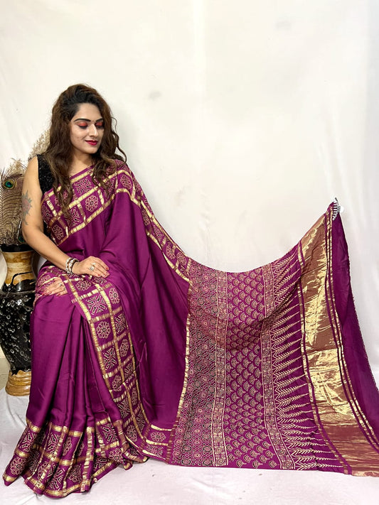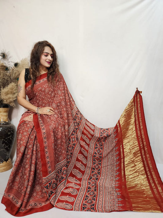Modal fine Silk Hand Blocked Ajrakh work Saree
