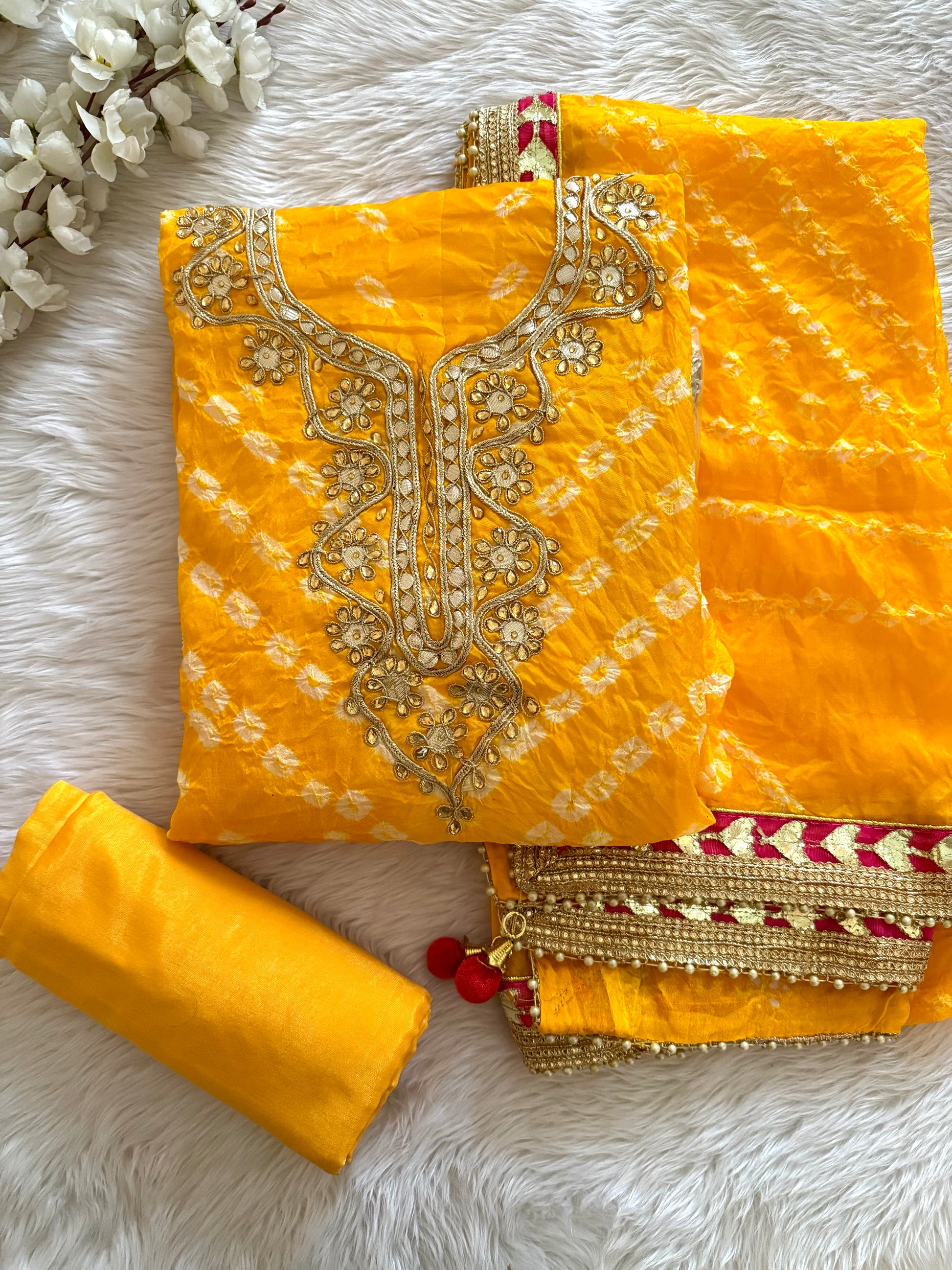 Silk Fabric Neck work with Fumka Work Dupatta Bandhani Dress Material ( Unstitched)