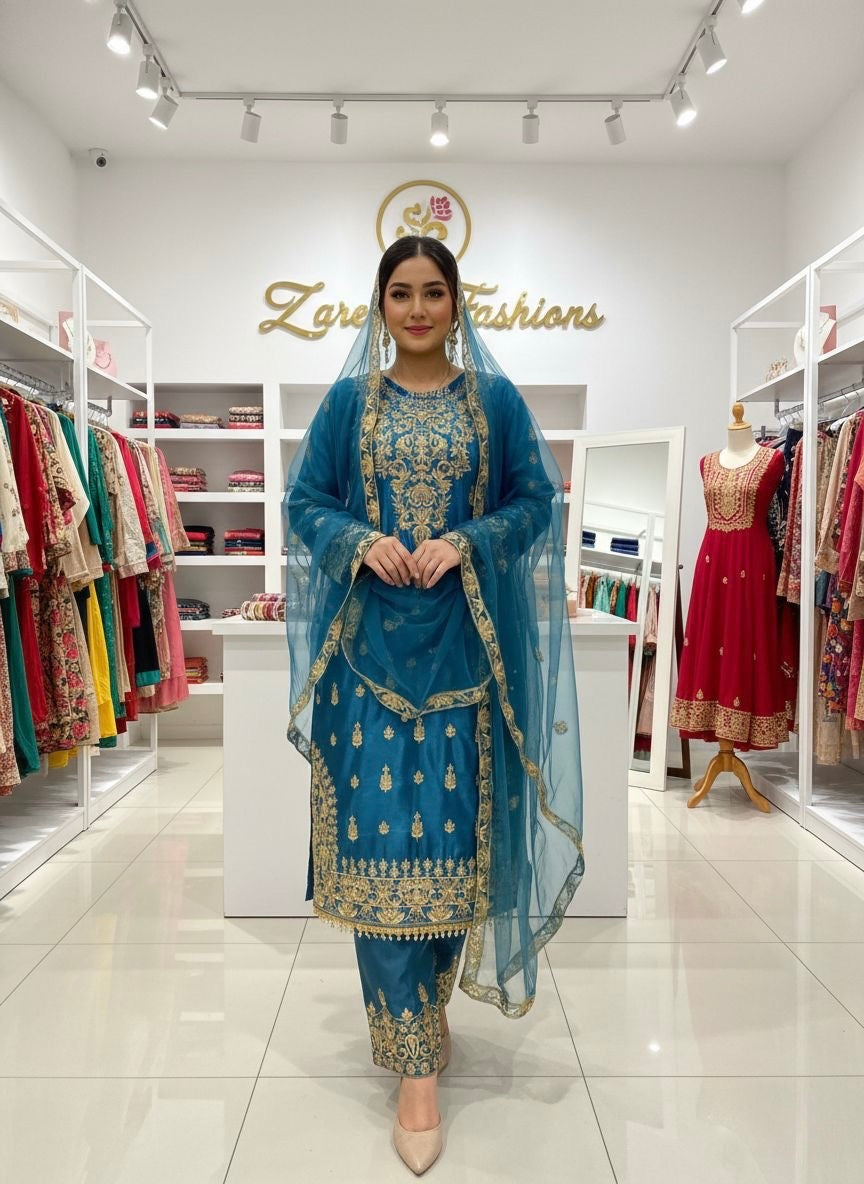 Chinon Silk Sequence Embroidery Work Eid Special Desinger Kurti Pant Dupatta Set (ready to wear)