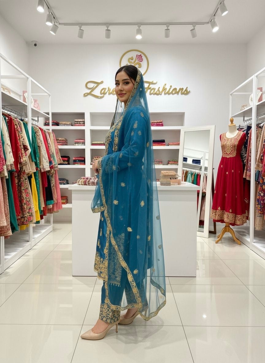 EID EXCLUSIVE AND TRENDY FOR WEDDING SEASON OUR PEDDING SEQUENCE EMBROIDERY WORKED TOP, PANT AND DUPATTA