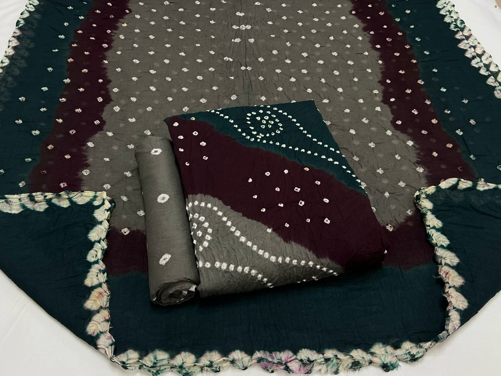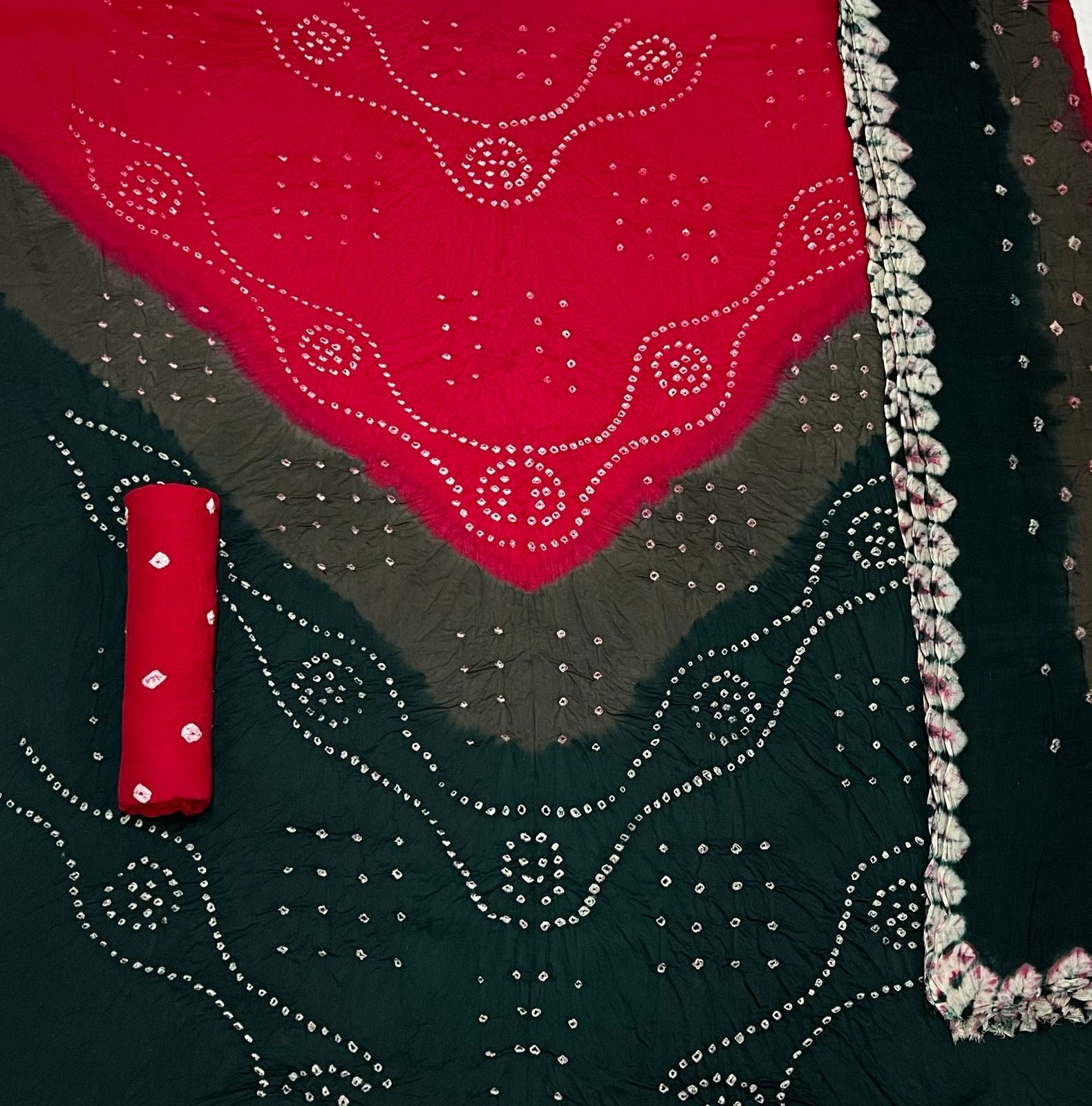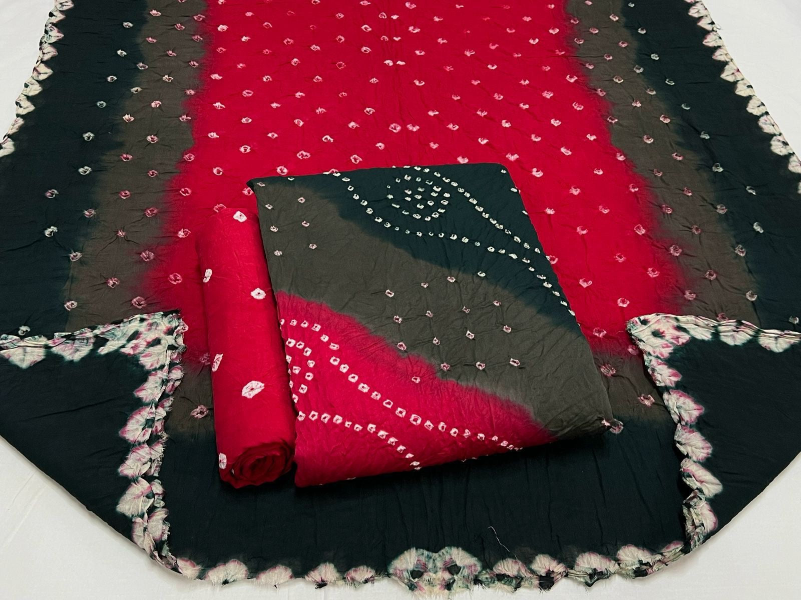 Cotton Satin V Pattern Multi Color Hand Crafted Kutch Bandhani Dress Material (Unstitched)
