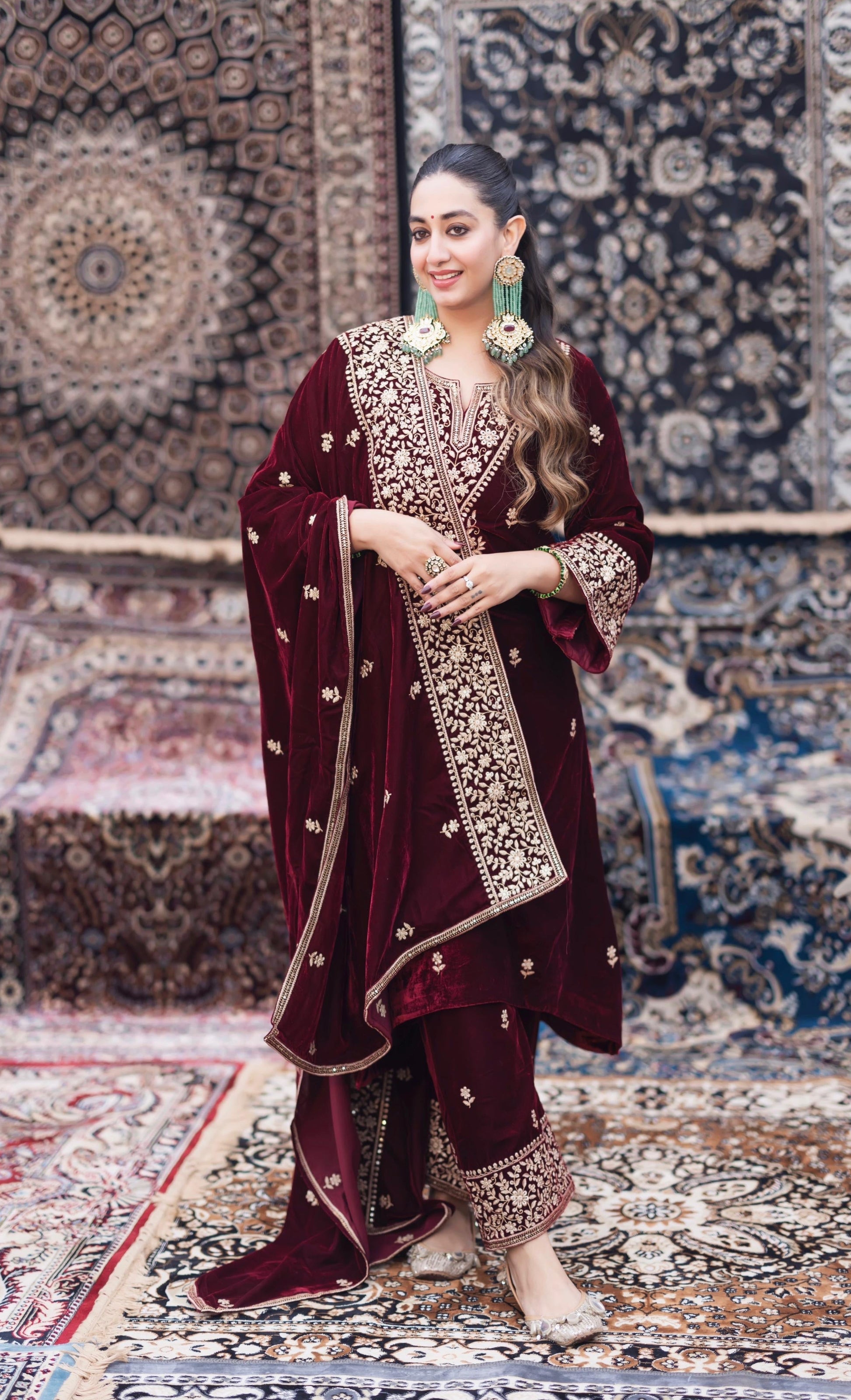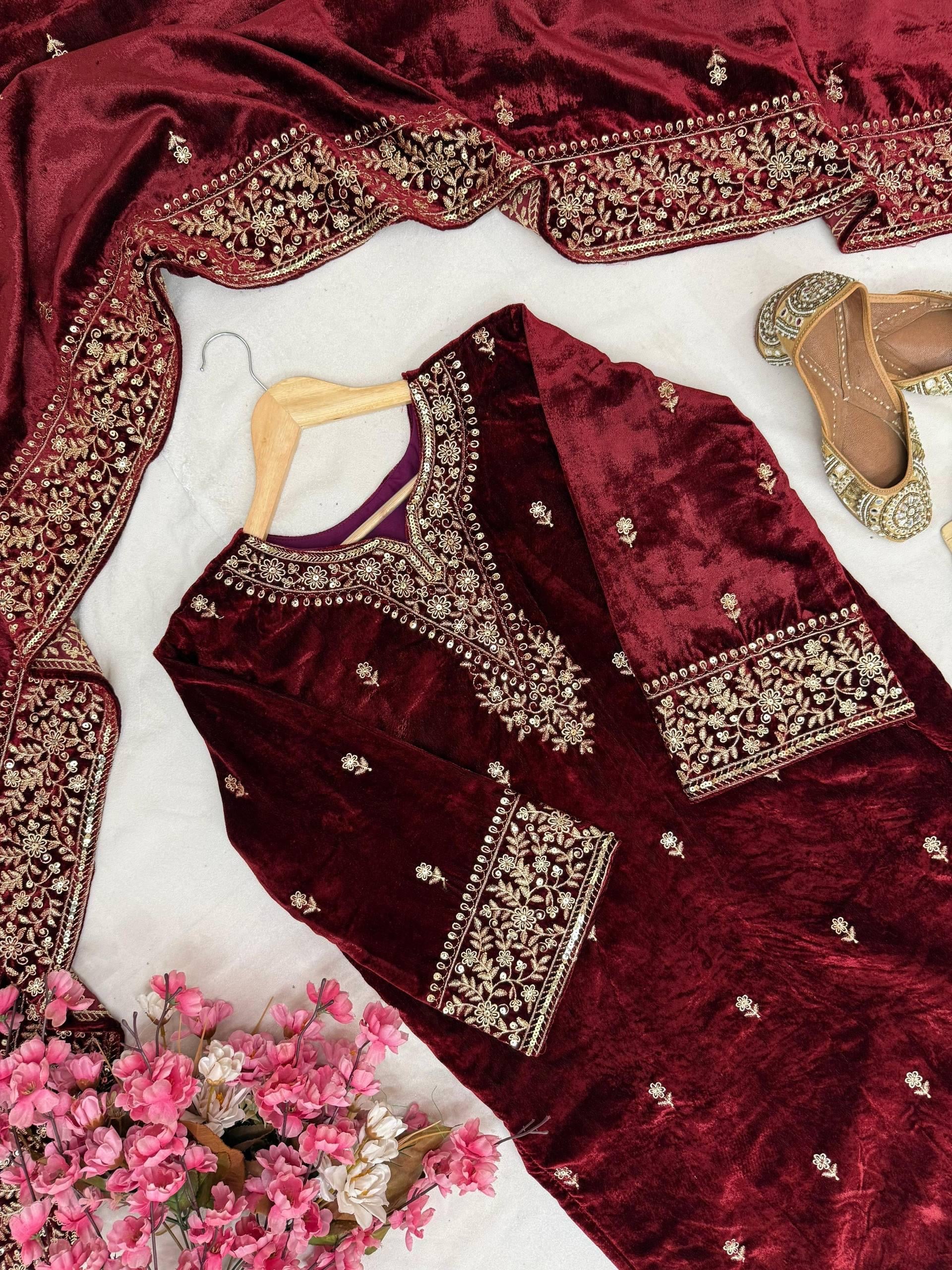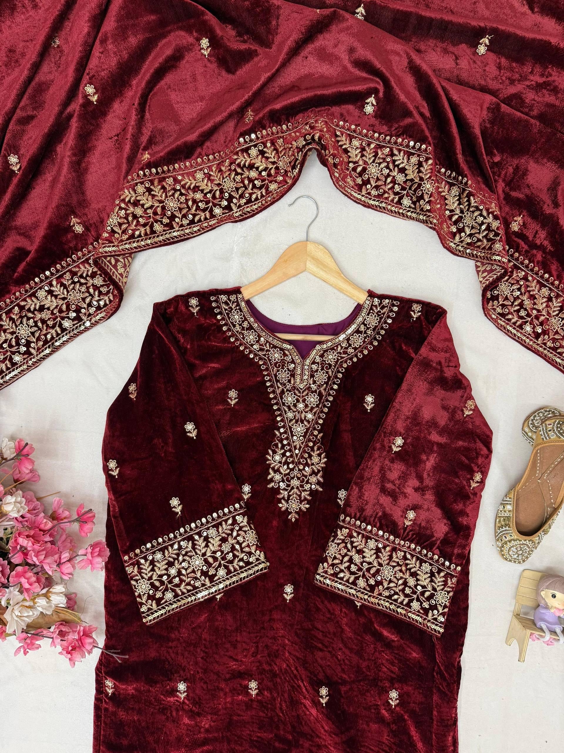 Ethenika Designer Embroidery Work Velvet Kurti Pant Dupatta Set (Ready to Wear)