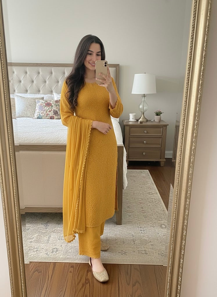 Faux Georgette Chikankari Kurti Palazzo Dupatta Set