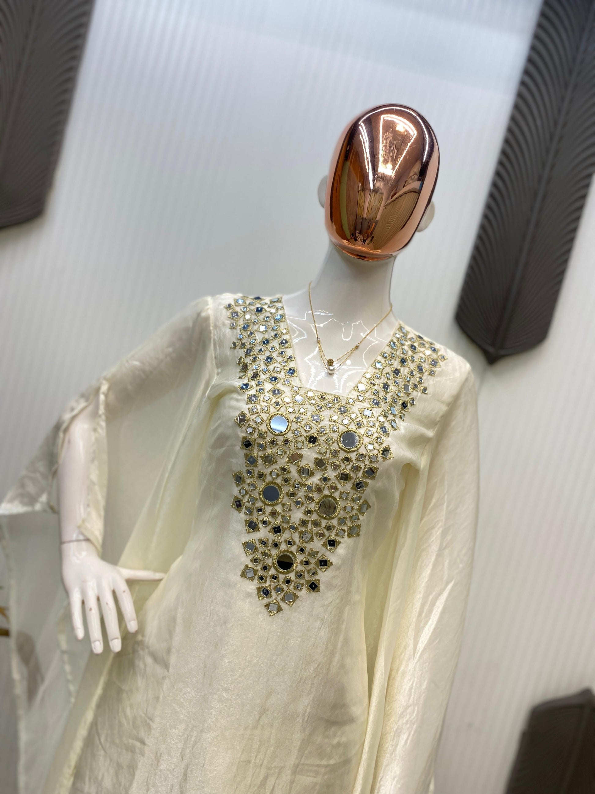 Fendi Silk Neck Read Mirror Work Embroidery DesignerKurti Palazzo Set (Ready to Wear)