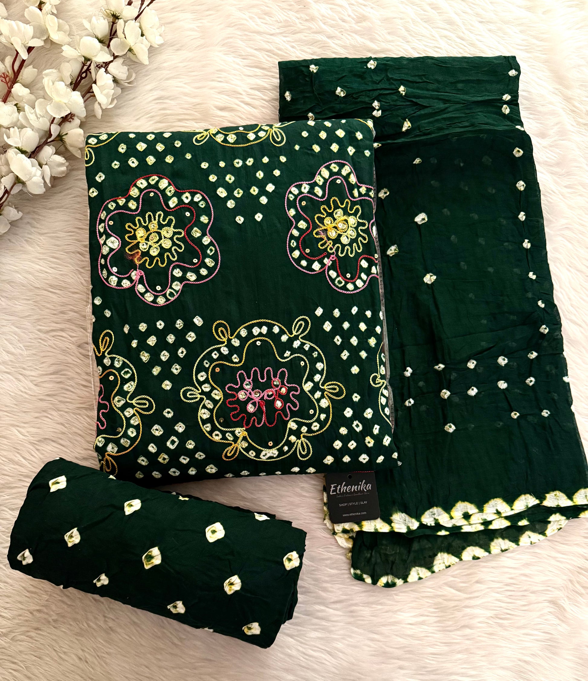 Soft Cotton Mirror Thread Work Bandhani Dress Material